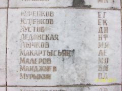 | Добрый день, уважаемые форумчане! В братской могиле воинов Советской Армии в пос. Солнцево Солнцевского района Курской обл. похоронен наш родственник Панин Егор Пантелеевич, рядовой, погиб 12.02.1943г. Есть ли возможность у кого-нибудь сделать фото плиты с фамилией? С уважением. --- Панин, Колтаков,Турищев, Ермаков, Паринов, Дронов, Внодченко, Чичик.