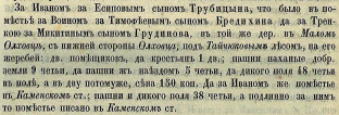 1652 л.398 За Тихоном Юрьевым сыном Трубицыным жребий в селе Круглой Поляне на реке Лесном Воронеже по выписи воеводы Афонасья Беклемишева 148 (7148=1640) году а на ево жребии двор помещиков. У него пять сынов -Мишка двадцати лет, Игнашко восемнадцати лет, Трифонка семнадцати лет, Тимошка шестнадцати лет, Мишка семи лет. усады в длину семьдесят, а поперечь двадцать сажень пашни паханые доброй земли семь четвертей да дикого поля на пашню тридцать три четверти в поле авдву потамуж сена меж поль и по заполью восемьдесят копен усадного леса всем помещиком вопче от усад их в длину на сто сажен а пашня ему пахать в селе Круглой поляне с помещики через десятину сено косить и всякими угодьи владеть по своей даче а в лес в Воронежской и в Хоботцкой въезжать ему с городскими и с уездными людьми вопче РГАДА ф 1209-1-1015 л398-398 об