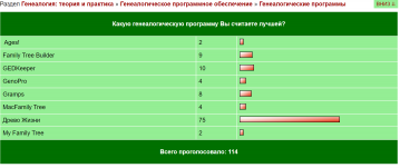 28 ноября 2022 12:03 При таких опросах никогда не учитывается, а пользовался ли опрашиваемый всем перечисленным? Или даже не слышал, и только поэтому считает худшим, чем знакомое? Про себя могу сказать, что попробовал всё, кроме MacFamily Tree, и лучшую не могу выбрать  Для схематичного отображения и управления большим древом и большим количеством данных без потери наглядности - однозначно GenoPro. Но для "красоты" надо "Древо Жизни", например, или что-то другое. --- Ищу: Пашнины, Саламатовы (с. Сугояк), Макаровы, Лебедевы, Казанцовы\Казанцевы из с. Русская Теча (сейчас Челябинская обл., в 19 веке - Шадринский уезд Пермской губернии). Науменко (переселенцы из Полтавской(?) губернии в Барнаульский уезд |