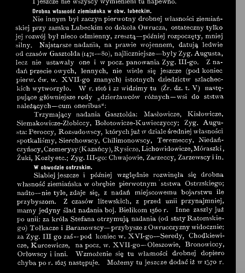 Не иначе, как первичное начало мелкого землевладения при замке Любечском вокруг Овруча, хотя его развитие было немного иным, впрочем — началось позже, менее сильно. Самые ранние пожалования, по военному праву, датируются едва ли временами Гаштольда (1471—80), самые многочисленные — при Сигизмунде Августе, однако они не прекращались и в начале правления Сигизмунда III. Из первых пожалований, ленных, еще немного (до конца первой четверти XVII века известных) значительных дворянских владений было создано. […]