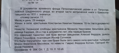 Здравствуйте, спасибо за информацию! Недавно кстати запрашивала её у Dalmatovec Моя 3прабабушка была в девичестве Засыпкина, звали Евдокия Михайловна, год рождения 1807г. Выйдя замуж, жила в Новопетропавловском, став по фамилии Назимова.