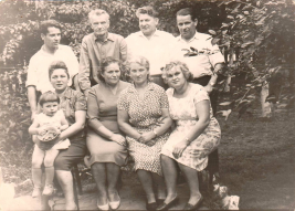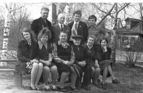 И еще одна семейная фотография. Фото сделано летом 1965 года в полисаднике дома №19. Определили по характерным кирпичам сложенным в виде окантовки сада. Назову тех, кого я точно помню по имени: слева стоит Галкин Анатолий Петрович, перед ним сидит его супруга Нина (в девичестве Прокофьева, не из Сабурово); крайний справа стоит мой дед Пётр Григорьевич, а левее стоит его брат Семен Григорьевич; внизу сидит в платье в горошек моя бабушка Аграфена Михайловна.