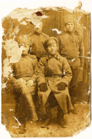 Знатоков прошу помочь с определением рода войск, а также любую другую информацию по данному фото. В первую очередь интересует сидящий военнослужащий в шинели. Ориентировочно 1916 г.