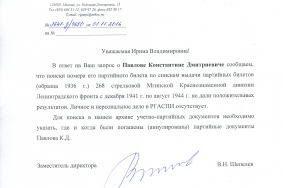 "...по Вашему запросу были просмотрены доку менты фонда Р-7880 "Коллекция учетно-статистических карточек коммунистов образца 1926, 1936 и 1954 годов, БД "Персоналии". В имеющихся учетных и статистических карточках, списках членов и кандидатов в члены ВКП (б) сведений о Павлове Константине Дмитриевиче, 1918 г.р., к сожалению, не обнаружено."