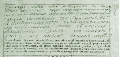 1795 года июнь ... Кавказского наместничества Георгиевской округи села Новозаведнного староста Михаила Афанасьев ....... состоявшего 794 года июня 23 ея имераторского величества ... публиковавшего указа ... общества ..... о положенных .....