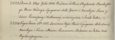[q] .... maj jndycta 0: swcego w Ouruzu urodzonego Hrycka Siemaszka ostatnicy woli dyspozycia ktora urodzonemu Wasilowi Siemaszk.... synowi swemu ziemi duze z ludzmi Jwana Zyrowicka y Chnata Połocza- nina zapisuie ziemio zas Korczynska Lopatyczami Petrasze.... Bochsawsczyzno z oboch stron rzeki Uszy grunta swoie maiąc.... stro swo chrenio urodzony Wasyl Siemasko aby się podzidil Dyspo[zyc]ię