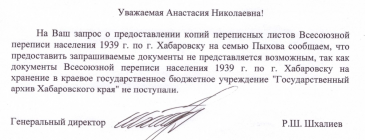 Добрый день. В ГАХК ответили, что документы по переписи 1939 года по Хабаровску на хранение не поступали