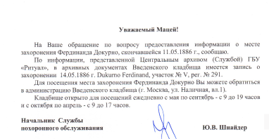 Последнее упоминание о могиле Фердинанда на Веденском кладбище в Москве относится к 30-м годам, к сожалению, мы не знаем, сохранился ли надгробный камень. Мне удалось определить точное местоположение могилы на кладбище из документов. но, к сожалению, у меня нет возможности проверить, есть ли он еще. Мы знаем о файлах, касающихся Фердинанда и Казимежа Докурно, в Государственном архиве в Санкт-Петербурге и Центральном военном архиве в Москве. Мы пытаемся связаться с ними. Мы постоянно ищем новую информацию о Фердинанде, особенно о его ранних годах, предках и потомках. Если вы знаете что-нибудь о нем или сталкивались с какой-либо дополнительной информацией, пожалуйста, сообщите нам об этом.