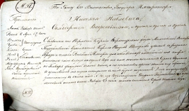 1846 года октября 19 числа города Минусинска.. ...жительствующие в городе Минусинске крестьяне Верхотурского уезда Махневской волости Максим Иванович Водеников с женой своей.....дали сие удостоверение в том, что крестьянин того же округа и волости Кирило Петрович Топорков, желающий вступить в брак с дочерью торгующего минусинского мещанина Петра Ильича Попова Настасьей Петровной....
