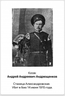 Казак урядник Андрей Андреевич Андрющенков. Станица Александровская. Убит в бою 14 июня 1915 года.