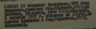 Интересует Кривенко Феодосий Федорович 1876г.р. Предположительно уроженец Кировска или Кировского по справке 1957г из КГБшного дела Само дело 1937 года но справка подколота 1957г и там фигурирует Кировск УССР Долго думали о каком Кировске идет речь - было решено что таковым в 1957году мог быть только пгт Кировское Соответственно в 1876 это Поповка Харьковской губернии Там вроде как с начала 19века была каменная церковь - возможно сохранились МК или ревизии Прадед с его слов с 10лет жил уже без родителей и работал но запись о рождении и родителях надеюсь в каком-то виде сохранилась В целом интересует любая информация по этому человеку исходя из этих данных Может кто-нибудьсможет чем-то помочь? Заранее спасибо PS Прилагаю вырезку из справки