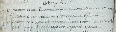 «…Семьи старшинские: …№16 Есаула Антона Самойлова Гетманова от первой жены сыновья: Иван 9 лет, Николай 7 лет, Савва 5 лет; Антона второбрачная жена Варвара 24 года, его от первой жены дочь Матрона 12 лет, его отец Самойла Иванов 87 лет…»