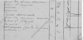 Спиридон Яковлев у нево жена Афимья Егорова дочь взятая того ж Кашинского ? уезда вотчины порутчика Александр Анре евича Травина деревни Дьякова по отпускной у него Спиридона Яковлева прижитыя с первую ево женою, написанной в последнюю пред сим ревизию сын Григорий у нево жена Афимья Тихонова дочь старинная той же вотчины села ? рожденныя после ревизии Иван Прохор