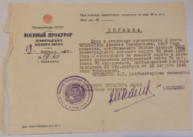 Пытаюсь найти подробности о деле своего деда, репрессированного в 1937-м. В сети не нашёл ничего. Единственный документ, которым располагаю, это справка о посмертной реабилитации, полученная в военной прокуратуре ЛВО в 1960-м году. Дед был военным. Согласно справке, был арестован Особым отделом НКВД Ленинградского военного округа 23 июля 1937 года. Состоял в должности начальника ветеринарной части 70 арт. полка 70 стр. дивизии (лошади пушки таскали).