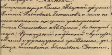 Из МК Варшавской православной Свято - Троицкой церкви за 1902 год. Актовая запись № 68. 06.11.1902 венчание: Жених – потомственный почетный гражданин, постоянный житель города Ростова Михаил Константинов АВЬЕРИНО, православного вероисповедания, первым браком, 25 лет. Невеста – дочь Германского подданного девица Леония Евгениева Дютли, латинского вероисповедания, первым браком, 26 лет.
