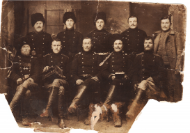 [q] Здравствуйте, интересуюсь родом войск на фотографии, более подробно хотел бы узнать про самого левого человека в нижнем ряду, про его награды в том числе.