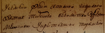 Дорогие друзья помогите пожалуйста прочитать имя крестьянина Сарапулова и второй текст- "У него жена Ульяна Федорова- 90 лет взятая с … слободы деревни … у крестьянина Сем…". Большое спасибо! Для пользы дела- речь идет о Колыванской области Бурлинский уезд Малышевская слобода, ревизия 1782 года.