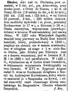 Согласен с Вашими выводами. Тем паче, что знаю эти места не из географического атласа, а лично отработал 10 лет в Толочине. Поэтому зацепило... К Вашей информации хотел бы добавить свою, из польскоязычных источников (ранее упомянутый Słownik Geograficzny królestwa polskiego i innych krajów słowiańskich, Tom VII): ..."Обольцы, местечко над рекой Оболянкой, Оршанского уезда, Аленовичской волости; на почтовом тракте из Орши в Сенно, в 45 верстах от Орши. Насчитывает 265 человек (132 муж., 123 жен.), из них 52 православных, 3 католика и 200 иудеев; церковь, синагога и почтовая станция, между Коханово (17 верст) и Сенно (26 верст). Старинное поселение, упоминаемая (возможно) ещё в Воскресенской летописи под названием Облче. В 1387 году Владислав Ягелло воздвиг здесь первый на Белой Руси католический костел, перестроенный в 1809 году; в настоящее время находится не в самом местечке, а в отстоящем от него на 1 версту селе Старые Обольцы; является филиальным Толочинского парафиального костёла. Построен из дерева под именем Успения Пресвятой Девы Марии, и до 1868 года был парафиальным. В 1430 году Обольцы упомянуты в составе городов литовских в грамоте утверждения Свидригайло на литовский трон. В XVI веке Сигизмунд Август пожаловал Обольцы вместе с Смольянами бежавшему из России князю Андрею Курбскому, который вскоре обменял их у Сангушко на Ковель, и с той поры находятся в составе обширных владений князей Сангушко. В настоящее время находятся во владении Зажецких..."