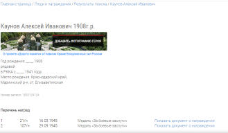 В документах о награждении в годы ВОВ встретил искаженную фамилию своего двоюродного деда. Место рождения говорит о том, что это он, Каун Алексей Иванович, но как принято :-) у наших писарей: - вечно они все коверкают.