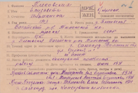 Так сложилась жизнь моей бабушки Елизаветы Ильиничны Плесовских из деревни Большая Плесовская. Я впервые задумалось о ее судьбе, когда в 9 классе мы писали сочинение, точнее реферат о войне, о том, как трудились женщины в тылу. Рассказ бабушки потряс меня. Сколько же сил — физических и духовных — надо иметь, чтобы перенести все эта — ссылку, голодную военную пору, унижение, а то и презрение со стороны тех, кто решал судьбу моей бабушки с 1931 по 1954 год, когда у нее не было даже паспорта? Низко кланяюсь в пояс своей дорогой и любимой бабушке за все ее страдания. Обидно только, что из дома с десятью окнами, в котором она жила в молодости в деревне Большая Плесовская, она на старости лет очутилась в гнилом бараке. Сейчас у нее одна мечта: пожить перед смертью в своей благоустроенной квартире. Всю жизнь надеялась, что барак снесут и дадут ей комнату — новую и светлую. Хочу обратиться к молодому поколению, тем, у кого есть бабушки и дедушки: не поленитесь — запишите воспоминания своих родных об их прошлой жизни, пока они не умерли. Много интересного и трагического они могут рассказать о нашем прошлом. Сохранить бы все эти воспоминания хотя бы на страницах газеты. Из таких эпизодов состоит история нашего округа, города. Мы не должна забывать об этом.[/more]И также далее я нашла на сайте музея (Ямало-Ненецкий окружной музейно-выставочный комплекс им. И.С. Шемановского https://collection.yanao.ru/ ) среди оцифрованных экспонатов скан документа - карточка спецпоселеца Плесовских Елизаветы Ильиничны: