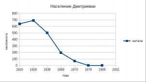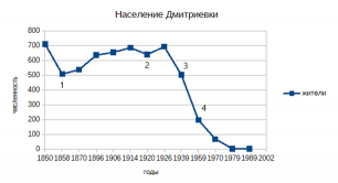 1920 Белебеевский уезд Елизаветинская волость д. Дмитриевка мужчин - 297 женщин - 343 оба пола - 640 1926 Белебеевский уезд Белебеевская волость Дмитриевский с\с д. Дмитриевка 335 357 692 1939 Белебеевский район Мало-Белебеевский с\с д. Дмитриевка 232 270 502 1952 Белебеевский район Мало-Белебеевский с\с центр - с. Дмитриевка с. Дмитриевка 1959 Белебеевский район Илькинский с\с д. Дмитриевка 85 112 197 1969 Белебеевский район Илькинский сельсовет центр д. Илькино д. Дмитриевка 88 чел. русские 1970 Белебеевский район Илькинский с\с д. Дмитриевка 26 42 68 1979 Белебеевский район Анновский с\с д. Дмитриевка 1 1 2 1989 Белебеевский район Анновский с\с д. Дмитриевка 1 1 2