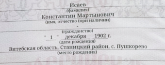[q] Здравствуйте! Мой прадед Исаев Константин Мартынович 1902 г. р. переселенец в Томскую губернию из села Пушкарево, Стаецкой волости, Витебской губернии. Подскажите, может кто нибудь при изучении метрических книг или других документов встречал фамилию Исаев? Буду рад любой информации.