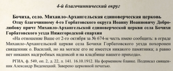11 января 2024 21:42 15 января 2024 22:41 Роспись Описи церкви с.Бочихи от 1904г из ГИМ: Ф.406, д.1882 86049/404 «Копия». Опись с. Бочихи Михайло-Архангельской церкви. Подлинник. Подписали: Священник Иоанн Сноведский, и.д. псаломщика К.Добротворский .Б.д. Опись памятников церковной древности, находящихся в Михайло-Архангельской церкви села Бочихи Горбатовского уезда. №№ Описание древних предметов Год или век происхождения предметов О храме: Вместо упраздненной в 1780 году по ветхости деревянной церкви в селе Бочихе построена зданием каменная во имя Архистратига Божия Михаила, с пределом, в трапезне, в честь Святителя и Чудотворца Николая. Настоящий храм начат строиться в 1824 году, что видно из храмозданной благословенной грамоты, данной Епископом Нижегородским и Арзамасским Моисеем, хранящейся в архиве при означенной церкви. По данным церковной описи, составленной в 1948 году, видно, что стройка храма вполне приведена к окончанию в 1831-м году. Храм имеет форму креста, двух этажный. Нижний этаж храма квадратный, верхний – круглый. Украшений наружных стен и внутренних храм не имеет. О существовании древних предметов, находящихся в ветхой деревянной церкви нет никаких данных: ни офисной книги, ни точных преданий как о церкви, так и обо всем в ней существующем. Существующая же описная книга от 1848 года не дает о том никаких сведений. Указаний на время написания образов, находящихся в новой церкви, не имеется. Так что при описании икон очень трудно приходится разобраться, какия иконы по своему написанию принадлежат к периоду своего начального существования до 1800 года, и какия поачти, - это требует большой опытности. Тем более, что все иконы написаны в духе старообрядцев- раскольников ( каких в приходе немало),- на подобие стариннаго письма. Некаторыя иконы, по преданию, были реставрированы, какия и когда именно, - неизвестно. Только при самом тщательном разсмотрении и сравнении икон можно, и то приблизительно, судить о древности некоторых из них. Опись древних предметов разделена на три части. I-я часть. Древния иконы в алтаре Св.Архистратига Божия Михаила: 1. В балдахине, вверху, над Св. Престолом на холсте написан образ Господа Саваофа Благословляющаго; длинною один аршин три четверти, шириною один аршин. Писан по красному фону. 2. У жертвенника на стене находится образ Христа Спасителя, лежащего во гробе ( Плащаница), писанный на холсте, в деревянных пяльцах, по темно ореховому фону; в длину имеет два аршина и один вершок, в ширину – четырнадцать вершков. В алтаре Святителя и Чудотворца Николая: 3. На горнем месте образ Триипостасного Божества, на на гладкой деревянной доске, - цвета ореховаго; длиною один аршин, шириной четырнадцать вершков. Древния иконы в прочих местах храма: 4. Аналойный образ Святителя и Чудотворца Николая, литой медный апчихе – чеканный; в длину – пядь, в ширину – три вершка. 5. Над входной церковной дверью, на паперти, три образа: Господа Вседержителя, Божией Матери и Св. Крестителя Господня Иоанна; дски аных абразов деревянныя гладкия, все одной меры, - в длину десяти, в ширину восьми вершков; краски на них от времени потемнели. 6. У правого клироса, в пределе Св.и Чудотворца Николая, хоругвь на деревянной гладкой доске, с изображением на адной стороне абраза Нерукотвореннаго Спаса, на другой – Знамения Пресвятыя Богородицы, - цвета ареховаго; длиною де