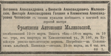 Да, именно объявление о кончине Франциски стало важным звеном, связующим нас с её мужем. К сожалению, Сололакское кладбище в настоящее время не существует, вполне вероятно он там тоже был похоронен около 1889 г. --- Ищу сведения о шляхтичах Малиновских и Нивинских, живших на Кавказе во второй половине 19-го века, их предках из Виленского края и потомках. | | |