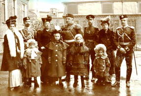 Справа от генерала – СГГ, еще правее его жена – Серафима Сергеевна, перед ними их дочь – Ольга (родилась 12 июня 1903). Мне кажется, Ольге на этой фотографии еще нет 4-х лет, что соответствует датировке. СГГ в мундире штабс-капитана 1-й батареи 3-й арт. бригады (петлицы «За военное отличие», «3» на эполетах, черный околыш фуражки). На груди орден св. Анны 3-й ст. с мечами и бантом, орден св. Станислава 3-й ст. с мечами и бантом, медаль «В память русско-японской войны», знак «В память 50-летнего юбилея нахождения Его Императорского Высочества Великого Князя Михаила Николаевича в должности Генерал-Фельдцейхмейстера».