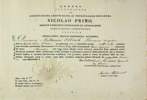 И еще не дает мне покоя вот такой вот документик. Если я правильно понимаю, то это некая выписка о том, что до поступления в университет имел некий аптекарский опыт - гезель третьего отделения. Сдавал какие-то экзамены на присвоение этого звания??? И что такое Imperatoria Medico-chirurgica Academia, Прочитал, что было их в Российской империи всего четыре. Я сомневаюсь между Виленской и Петербургской академиями... До Петербургской добраться ему было бы очень не просто в силу своего вероисповедания, как я понимаю в те времена это была большая роскошь для еврейского юноши. Виленская, же начала так называться только в 1832 г. (а в бланке стоит 1829 г., но бланк мог заполняться гораздо позже, непосредственно перед поступлением в Дерптский институт, около 1834 г.) Следующим листом в деле приложен некий документ на немецком языке, с небольшой припиской на русском и печатью Могилевской врачебной управы, о том что Эльрих Матвей действительно гезель обладающий достойными званиями.