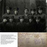 Слева направо с верхнего ряда: 1. Хомякова Ада 2. Галиев Даниил 3. Тютюнник Юрий 4. Султангалиев Александр 5. Алимбаев Бекен 6. Юрченко Раиса 7. Глумова Лидия 8. Есина Нина 9. Сёмшина Надежда 10. Беднарик Мария 11. Ситникова Юлия 12. Дружинина Анна 13. Бакиева Валентина 14. Кряжева Мария 15. Садовая Любовь 16. Веселова Раиса 17. Миргородская Мария 18. Киселева Анна 19. Прокопенко Нина 20. Беланова Нина 21. Нигматулина Рая 22. Погорелова Александра (Шура) 23. Соснина Валентина 24. Цапова Мария 25. Оспанова Екатерина 26. Сумина Раиса 27. Ламбина Людмила 28. Кудинова Светлана 29. Рейхвальд Рая 30. Лифанова Августина 31. Курбатова Надежда 32. Бондаренко Людмила 33. Бараев Иван Ефимович (по телеграфии) 34. Аверкиев Василий Иванович (начальник) 35 Лунёва Таисия Фёдоровна (учитель географии и клас.рук.) 36. Мостинец Пантелей Кузмич (военрук) 37. Меньшикова Александра (Шура) 38. Пилипенко Лидия 39. Пономарёва Рая 40. Иванова Вера 41. Громакова Рая 42. Омельяненко Нина (староста)