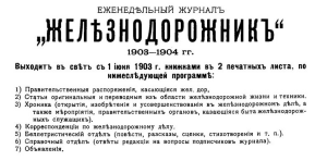 6 января 2014 15:55 о журнале "Железнодорожник" (1903-1909 г.г.) Интересную информацию о положении служащих РУЖД (как, впрочем, и других железных дорог России ), можно почерпнуть из журнала "Железнодорожник", еженедельного иллюстрированного издания, выходившего с 1 июня 1903 по 24 сентября 1909 г. Издатели: Н. Н. Палибин, Б. И. Кауфман и А. П. Топиро. Ред. Н. Н. Палибин. Включал общественно-политические статьи, обсуждение различных ж.д. тем, информацию по ЖД России, документы ж.д., некоторую статистику, рассказы.