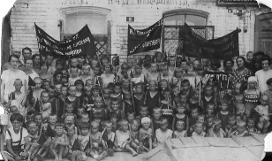 На знамени надпись СССР, а он был создан 30 декабря 1922г. Герб СССР 1923 г содержал по 3 ленты на каждой половине.Утвержден 6 июля 1923г. А фото с детьми зачем перевернуто? --- Вилины,Кармаковы-Петербург,Ярославская губ.,Москва