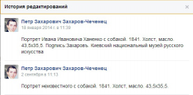 12 октября 2015 22:00 19 января 2020 12:58 AnnuchkaМне стало интересно, почему Вы свой вопрос задали сразу после редактирования названия картины "В контакте" - 2 сентября... Если у Вас есть информация о картине, которая неизвестна нам, то мы будем ждать Вашего сообщения. Вы спрашивали меня о портрете. Надпись под присланной мне фотографией совпала с той, что была прикреплена "В контакте"... [q] Портрет Ивана Ивановича Ханенко с собакой. 1841. Холст, масло. 43,5х35,5. Поgпись:Захаровъ. Киевский национальный музей русского искусства[/q]