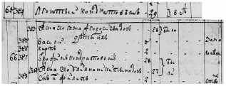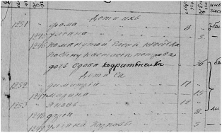 | Tomilina Модератор раздела С.Петербург - Москва Сообщений: 7875 На сайте с 2016 г. Рейтинг: 14110 | ИВ 1764 (церковный приход - церковь с. Лотаки) Николаевка №56 321 Семен Кондратов сын 42 Жена его Мария Куприянова дочь 38 Дети их: Яков 16 Феодора 17 Дария 9 Яков 25 Жена его Параскевия Парфенова дочь 24 Помянутого Семена зять Кондрат Филиппов сын 23 Жена его Гликерия Семенова дочь 21 №65 354 Леонтий Кондратов сын 29 Жена его Елена Феодосьева дочь 28 Дети их – Василий 5 Карп 2 №66 357 Трофим Кондратов сын 28 Жена его Ульяна Никитина дочь 27 Сын их Филипп 2 _____ ЦГИАК. Ф.57 о.1 д.123 (Румянцевская опись) - Сообщение Tasha56 1767 г. Стр.462об.-463 №3 Двор Отрох Кондратов Телицебородов 35 жена его Улияна Никитина 35 сын его Филипп 3 работник Кузма Петров Берур 15, слободи Кургановки. Стр.463-463об. №4 Двор в оном хата 1, з сенцами, амбар 1, конюшня рубленая 1, сарай 1, овин 1 В оной живет Левон Кондратов Телицеборода 35 жена его Алена Федосова 30 дети их Карп 4, Анна 9, Марина год работник Сидор Петров Грибанцов 20 в год получает деньгами 1 руб.50 коп. При доме его огород пенечный (пеньковый - примеч. мое) посевом конопель (выращивание конопли - примеч. мое) на четверичок Поля под собою имеет разробленого (разбросанных - примеч. мое) в лесе в разных местах на котором посевает ржи 6 четверичков Яриного овса 6 четверичков, гречки 3 четверичка, ячменю пол четверичка, пшеницы пол четверичка, гороху ковш, проса ковш. Сена накашивает в лесу в разных местах возов на 2 У него скота - конь 1, кобыла 1, корова дойная 1, яловая (которая не телится - примеч. мое) 1, свиней 3. _____ ИВ 1799 (церковный приход - церковь с. Лотаки) Ивановка №181 1243 Елена Федосова дочь вдова КОНДРАТИХА 60 Сын ее Евсей Левонтьев 28 Жена его Параскевия Левонтьева дочь 26 Дети их – Фома 8 Ульяна 5 Помянутой Елены невестка по сыну Карпу - Настасия Петрова дочь вдова КОНДРАТЕНЧИХА 36 Дети ее – Димитрий Карпович 17 Марина Карповна 15 Яков Карпович 12 Дария Карповна 8 Ульяна Карповна 5 №182 1254 Василий Леонтьев сын КОНДРАТЕНОК 45 Жена его Параскевия Халамонова дочь 45 Дети их: Иван 23 Игнат 18 Сильвестр 16 Авдей 14 Параскевия 12 Анна 9 Нестер 20 Жена его Параскевия Семенова дочь 20 Детей нет. Помянутого Ивана жена Мария Прокофьева дочь 26 Детей нет P.S. Таша, что-то с возрастом разброс получился. |